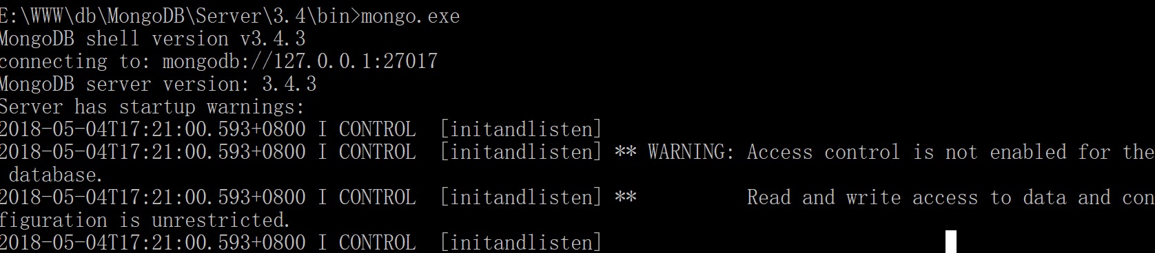 使用Mongo服务,执行: "E:\WWW\db\MongoDB\Server\3.4\bin\mongo.exe" 返回: